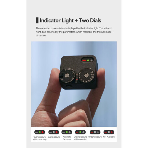 Thiết kế của Light Meter II hướng đến sự đơn giản và trực quan khi sử dụng: nó được trang bị 2 vòng xoay dễ tiếp cận (một cho ISO và một cho shutter speed / aperture), cùng một đèn chỉ báo để hiển thị trạng thái phơi sáng.