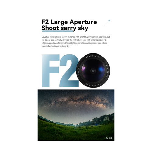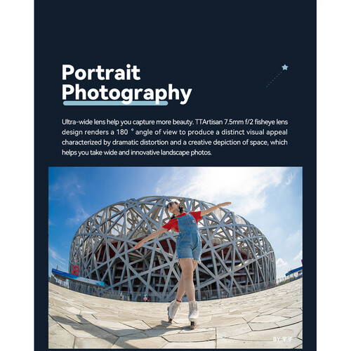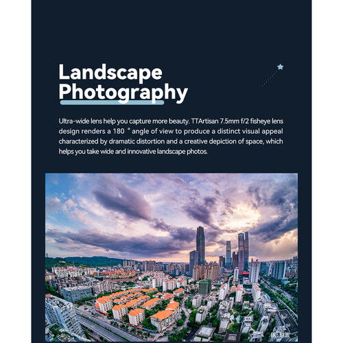 Ống kính TTArtisan 7.5mm f/2 Fisheye là một ống góc cực rộng (fisheye) mang bản sắc độc đáo, dành cho máy ảnh mirrorless dùng cảm biến APS‑C, đồng thời thể hiện hình ảnh circular fisheye khi dùng trên máy full‑frame (với viền tối rõ). Với độ mở khẩu lớn f/2, nó cho khả năng thu sáng tốt trong điều kiện ánh sáng thấp, đồng thời khai thác hiệu ứng biến dạng mạnh đặc trưng của fisheye – hình ảnh méo, trường nhìn cực rộng – để tạo cái nhìn “không gian khác thường”.