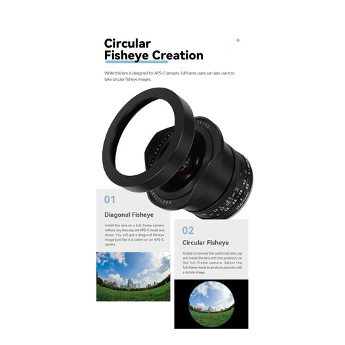 Ống có cơ chế lấy nét thủ công hoàn toàn (manual focus), vòng khẩu độ có khấc (clicked aperture ring), không có hệ thống ổn định hình ảnh (Image Stabilization), thân lens tương đối gọn với kích thước ~ ø72 × dài 57 mm và trọng lượng khoảng 370 g. Lens có góc nhìn ~180° trên cảm biến APS‑C, tạo ra hiệu ứng rất mãnh liệt – rất thích hợp nếu bạn muốn ảnh có style mạnh, đặc biệt cho phong cảnh, nội thất, sáng tạo nghệ thuật.