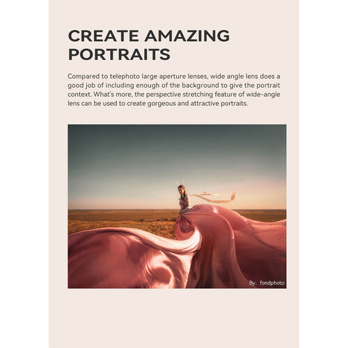 Ống sử dụng lấy nét thủ công hoàn toàn, có vòng khẩu độ với khấc (“clicked aperture ring”), thấu kính có hood tích hợp, và đính kèm adapter để gắn filter 72mm ở mặt trước – điều này rất quan trọng để sáng tạo với filter như ND, CPL mà không phải tìm filter đặc biệt đắt tiền. Với góc nhìn rộng ~105°, nó rất phù hợp cho phong cảnh, kiến trúc, chụp nội thất, cũng như chụp môi trường rộng lớn. Ưu điểm nổi bật còn có trong thiết kế vật liệu và hoàn thiện: thân lens chắc chắn, chi tiết thiết kế tốt, phụ kiện đầy đủ (nắp trước/sau, nắp filter holder, bảo hành nhà sản xuất).
