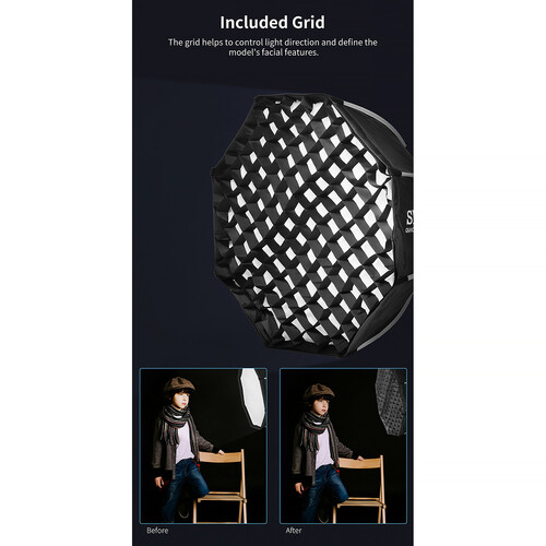 Bên cạnh đó, softbox đi kèm hai lớp khuếch tán (inner + outer diffusion) giúp tăng độ mềm của ánh sáng, đồng thời làm giảm độ tương phản mạnh, mang đến làn sáng mịn và tự nhiên hơn cho khuôn mặt. Đặc biệt, lưới định hướng ánh sáng (fabric grid) cũng được tặng kèm, hỗ trợ kiểm soát phạm vi chiếu sáng, giảm ánh sáng tràn và tăng chiều sâu cho hình ảnh – điều rất quan trọng trong quay phim cinematic và setup phức tạp trong studio.