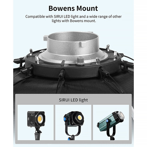 Một ưu điểm khác không thể bỏ qua là softbox sử dụng ngàm Bowens tiêu chuẩn, tương thích hoàn hảo với hầu hết các loại đèn LED chuyên nghiệp trên thị trường như Sirui C60/C150, Godox SL60, Aputure Amaran, SmallRig, Nanlite và nhiều hãng khác. Điều này giúp người dùng tiết kiệm chi phí, không phải mua thêm phụ kiện chuyển đổi.